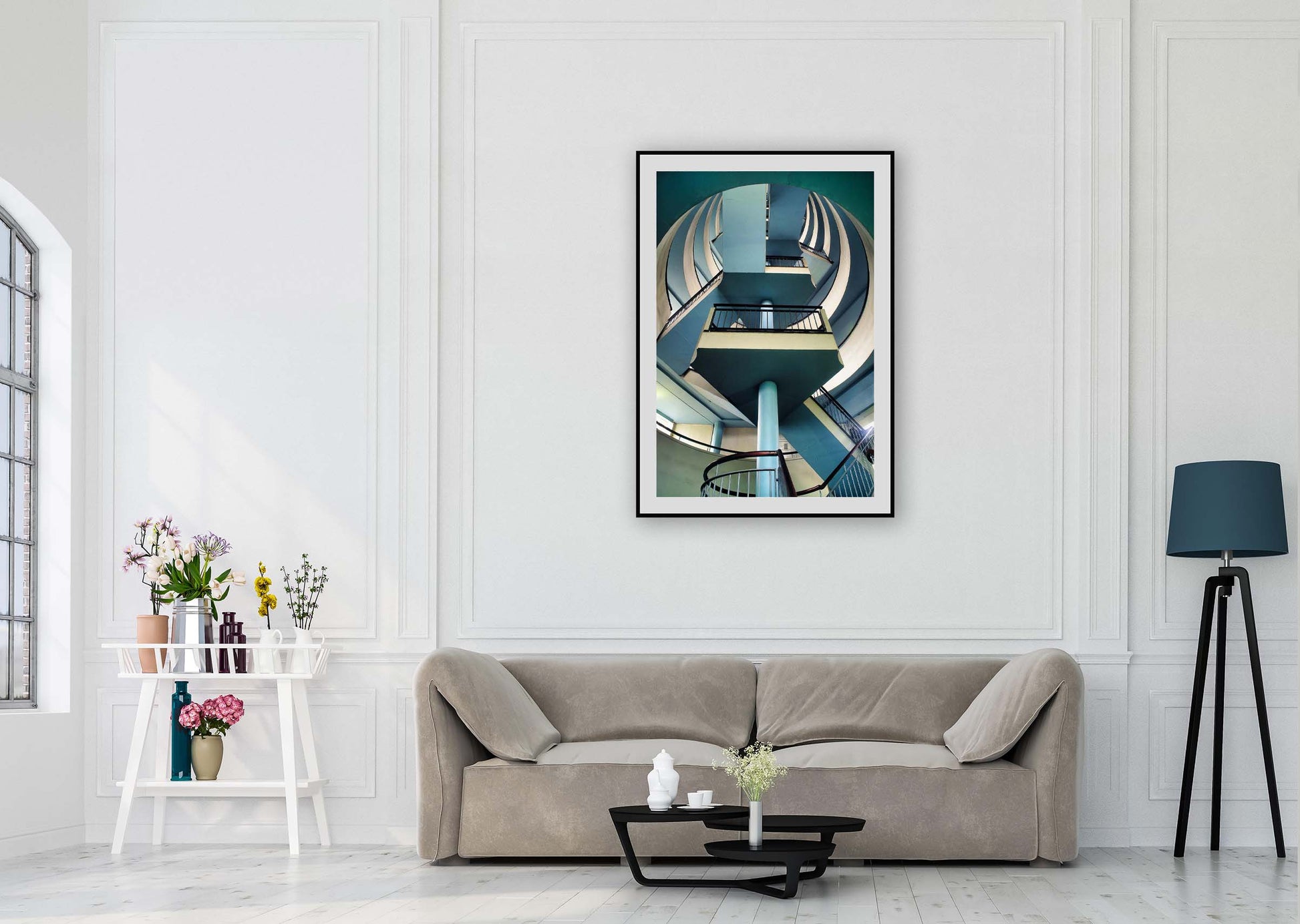 Stylish colour, fine art image of an elegant staircase in Bevin Court by the architect Lubetkin taken by the photographic artist, Anthony Weller