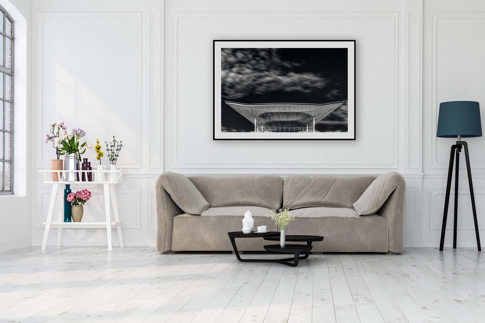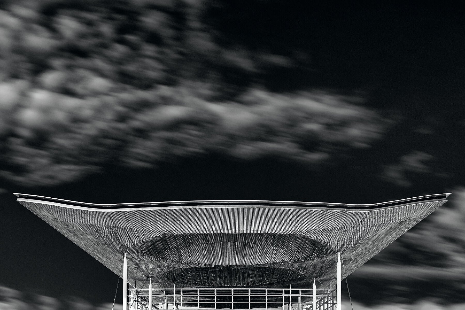 Elegant black and white, fine art image of the Welsh Assembley Building in Cardiff designed by the architect Richard Rogers by the photographic artist, Anthony Weller