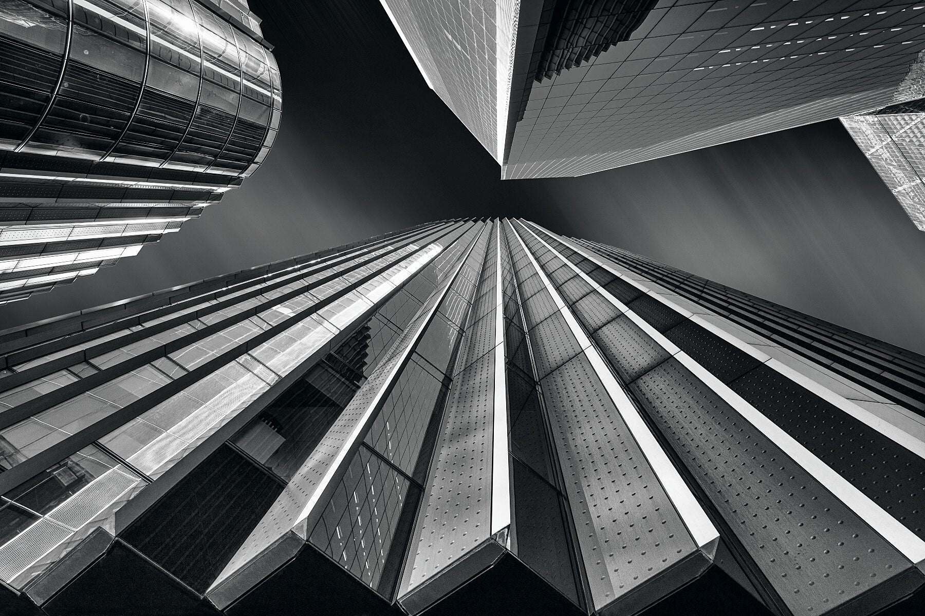 Dramatic black and white, fine art image of facades in the City of London by the photographic artist, Anthony Weller