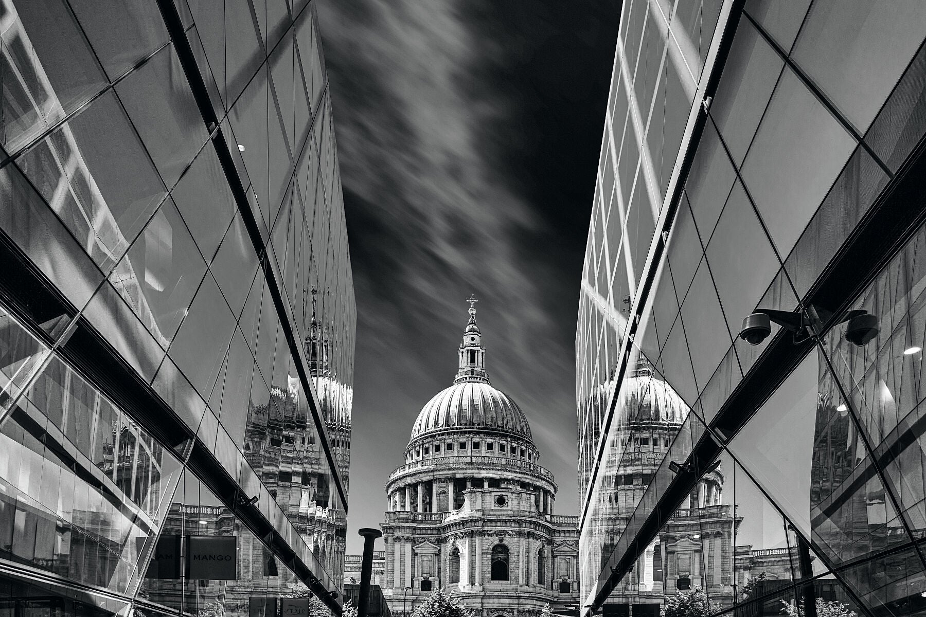 Stylish black and white, fine art image of St Pauls from the One New Change Building by architect Jean Nouvel by the photographic artist, Anthony Weller