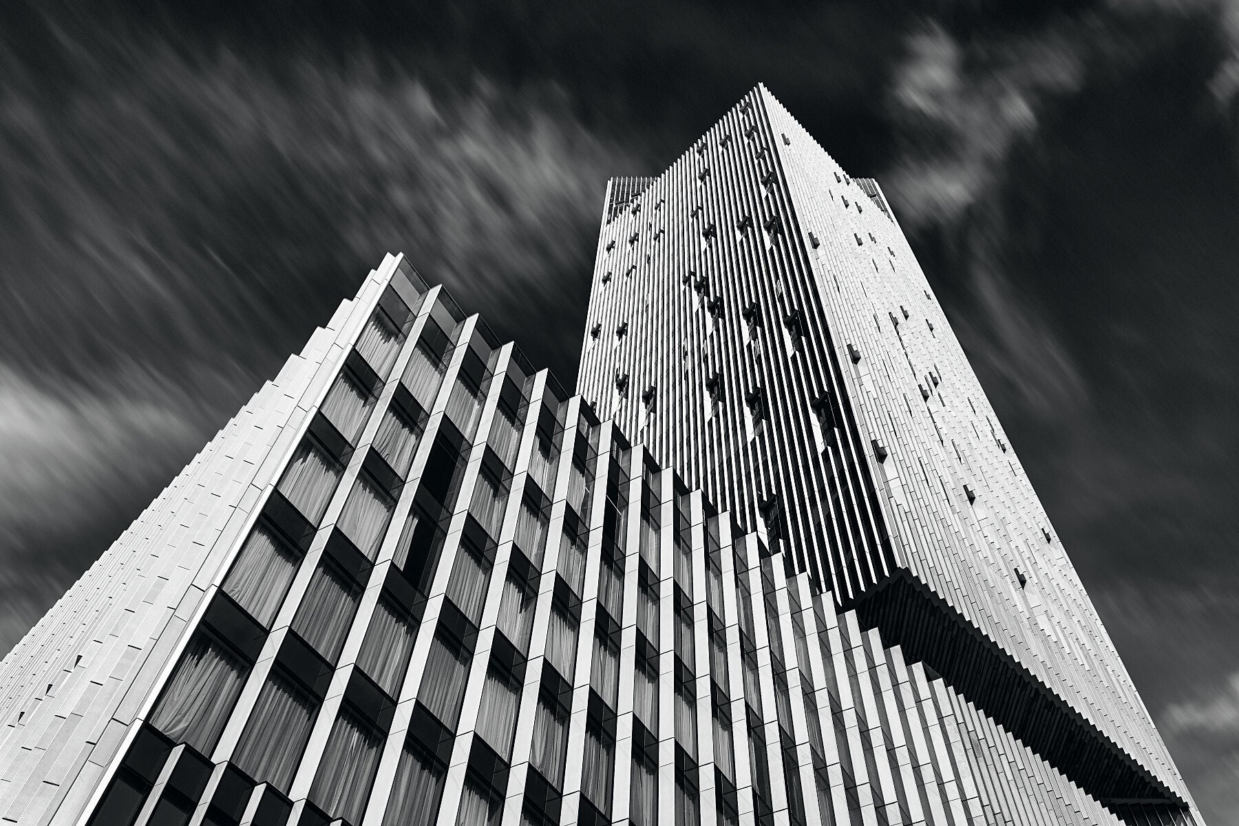 Dramatic black and white, fine art image of the Stratford Hotel in London by architects SOM by the photographic artist, Anthony Weller