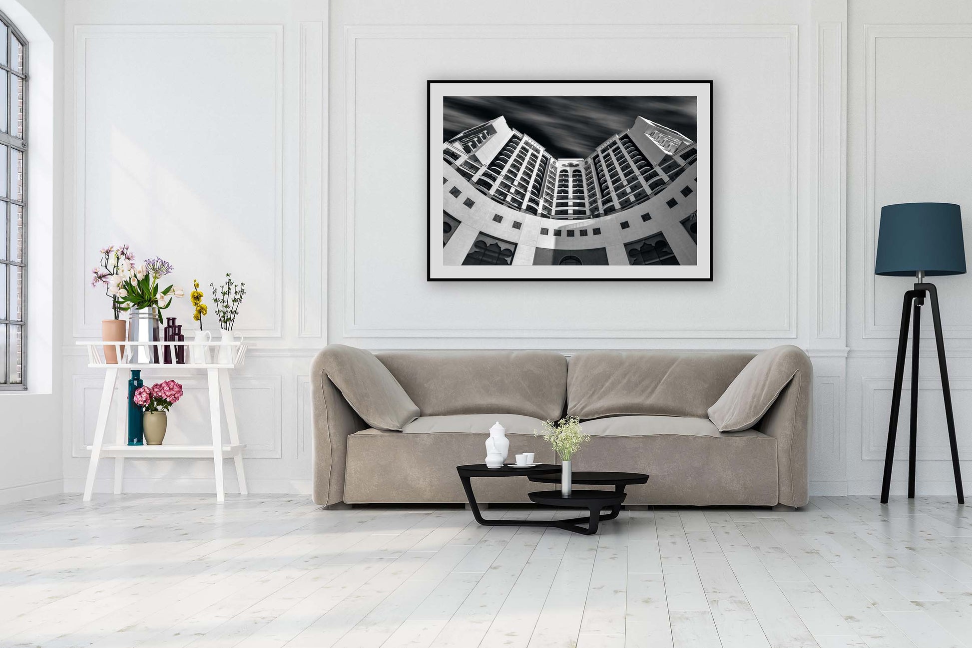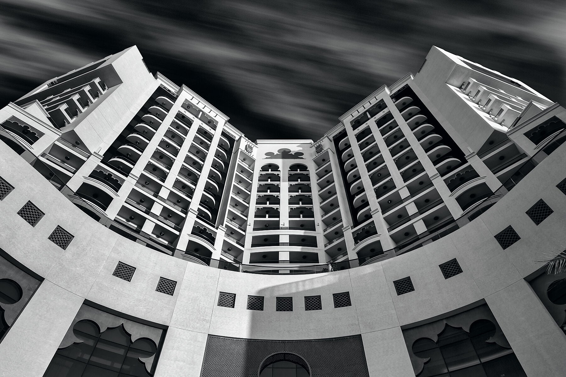 Eye-catching black and white, fine art image of a hotel in Ajman, UAE by the photographic artist, Anthony Weller