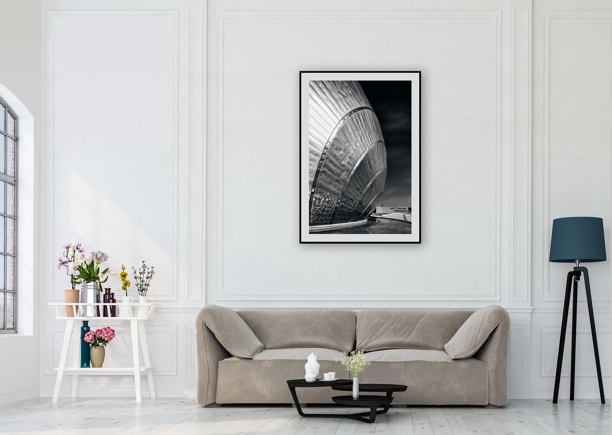 Striking black and white, fine art image of the Glasgow Science Park by architects BDP by the photographic artist, Anthony Weller