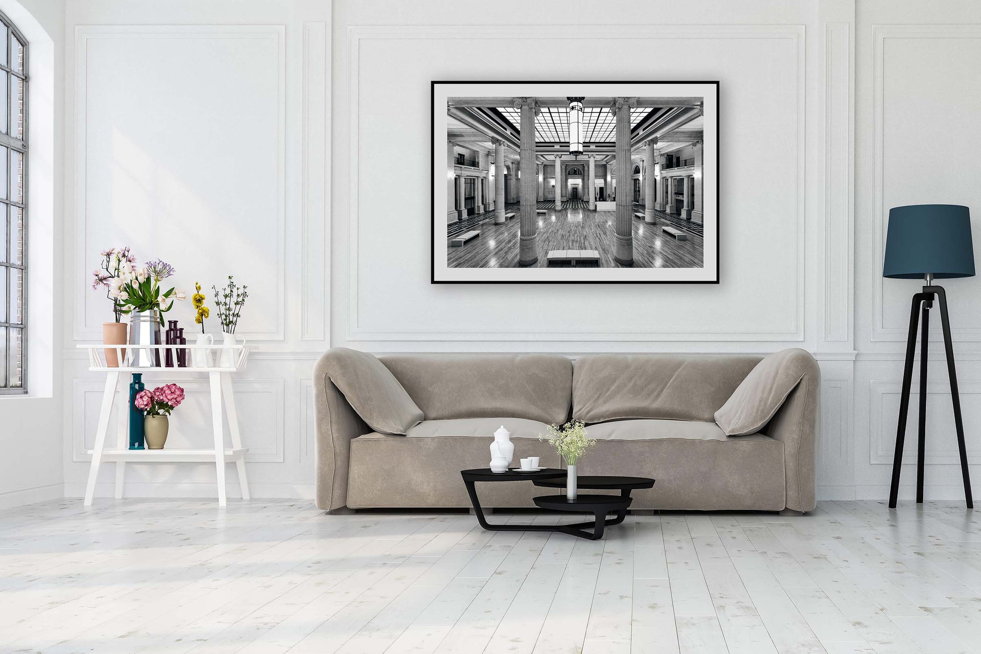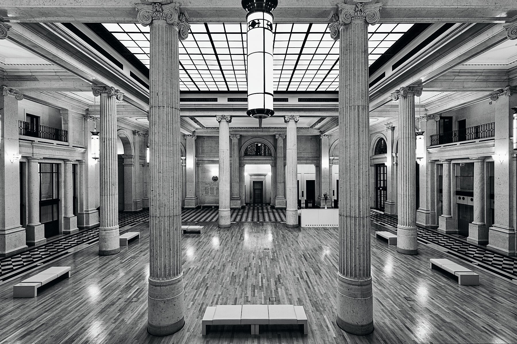Striking black and white, fine art image of an old Westminster Bank, banking hall in the City of London by the photographic artist, Anthony Weller