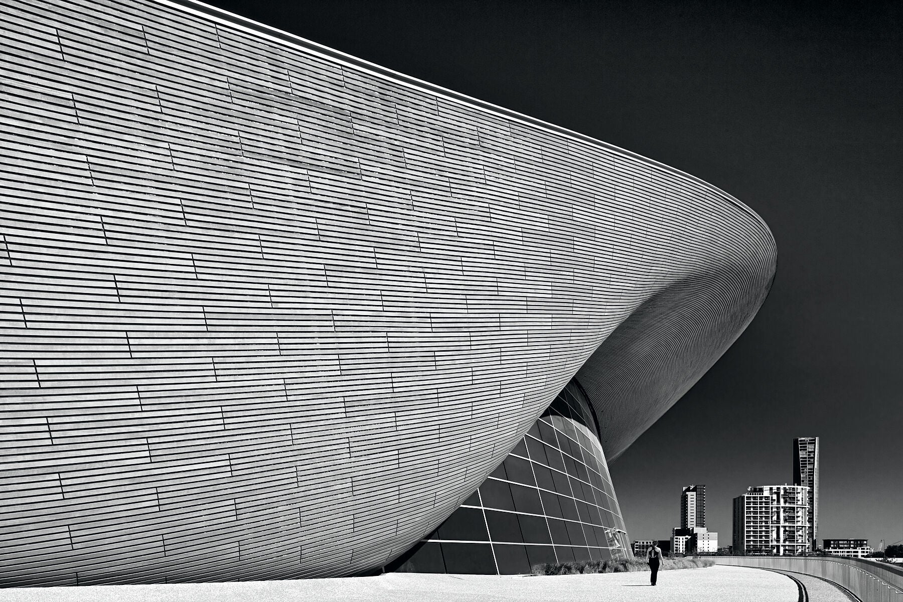 Beautiful black and white, fine art image of the Aquatics Centre, Stratford designed by Zaha Hadid by the photographic artist, Anthony Weller