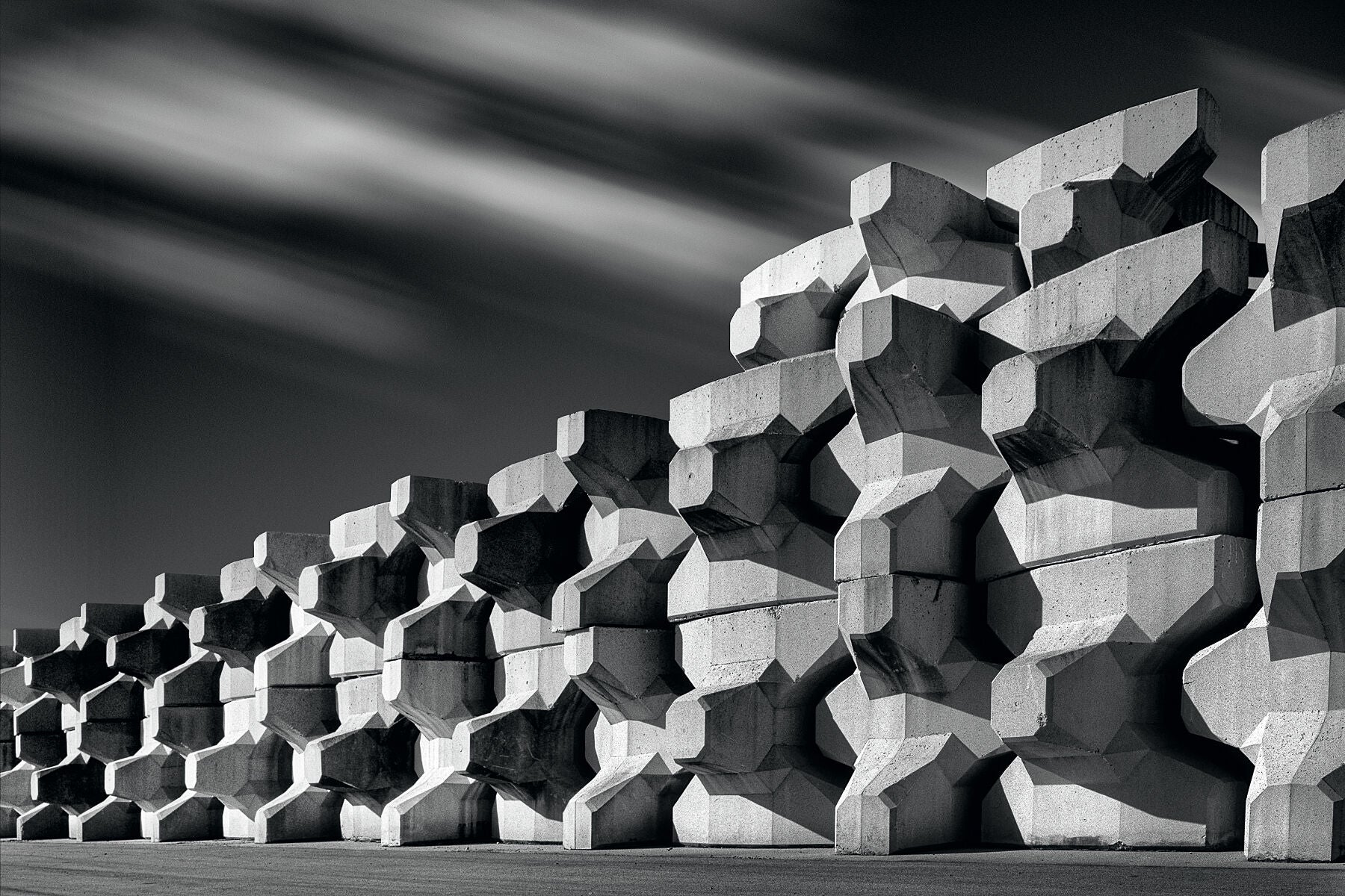 Dramatic black and white, fine art image of coastal storm wall blocks by the photographic artist, Anthony Weller
