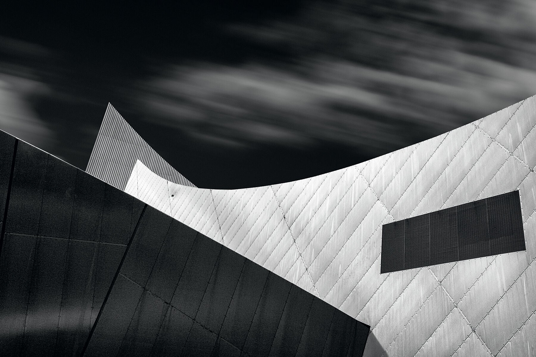 Abstract black and white, fine art image of the Imperial War Museum North by the architect Daniel Libeskind by the photographic artist, Anthony Weller.