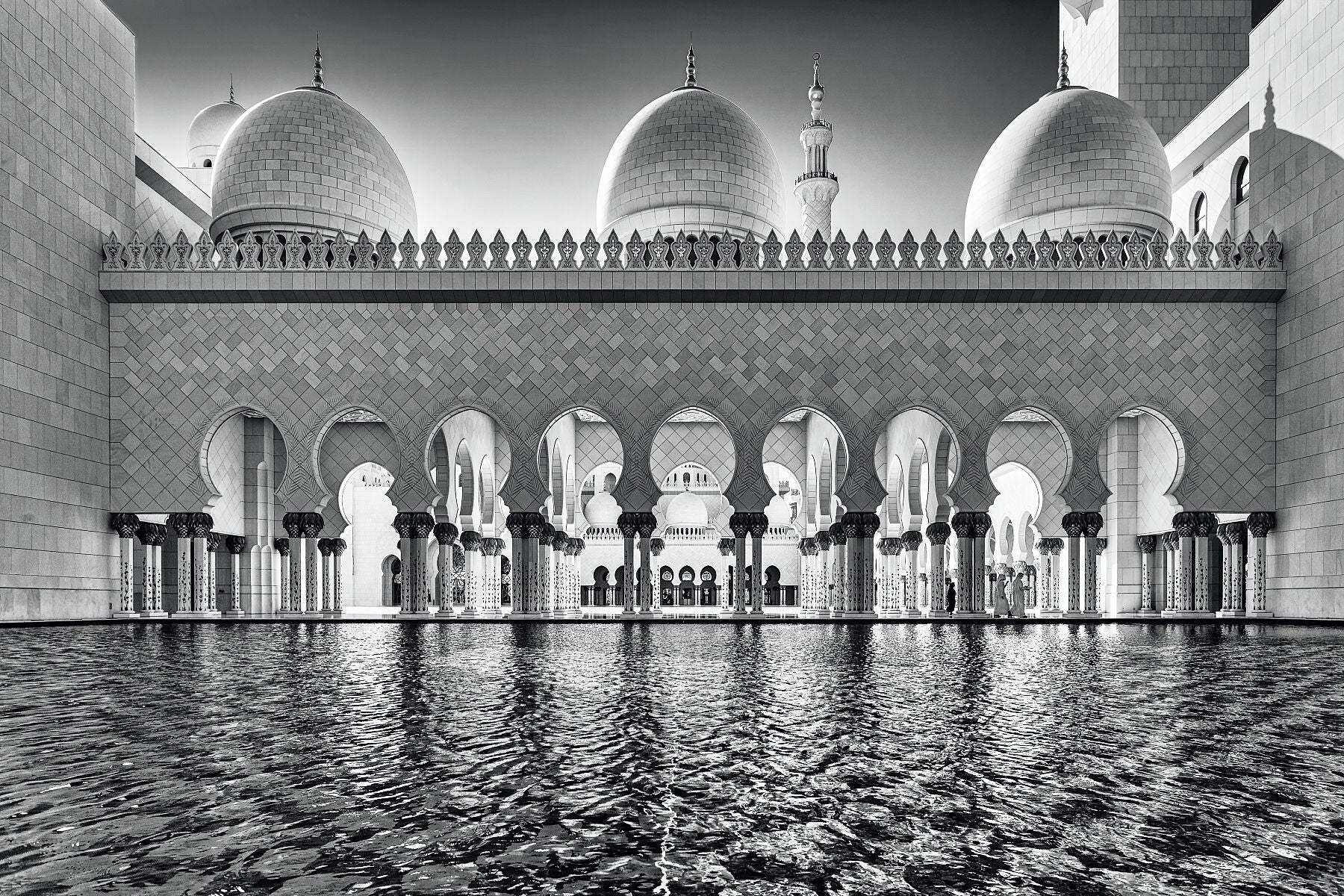 Striking black and white, fine art image of the Grand Mosque in Abu Dhabi by the photographic artist, Anthony Weller