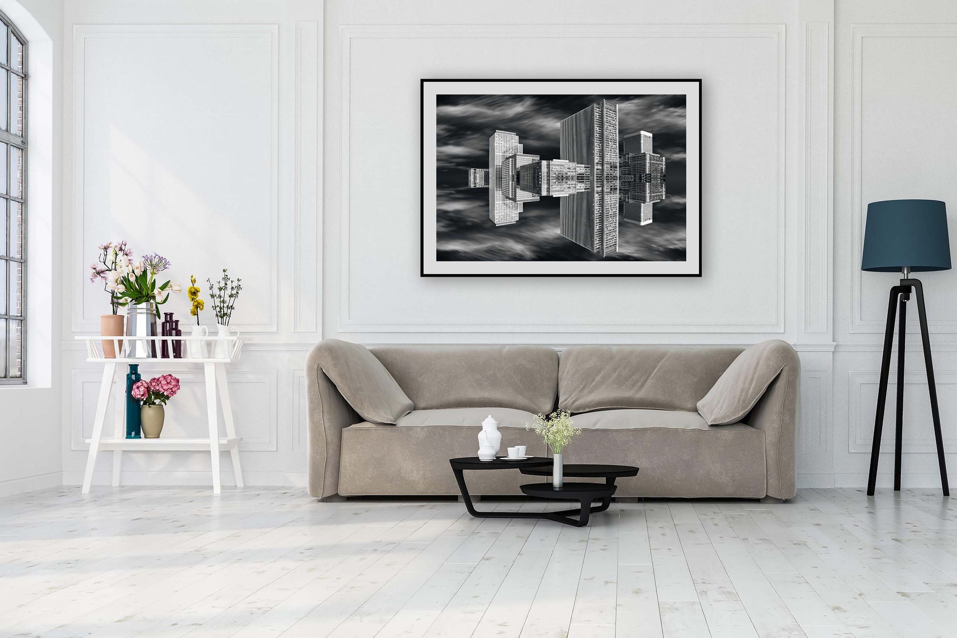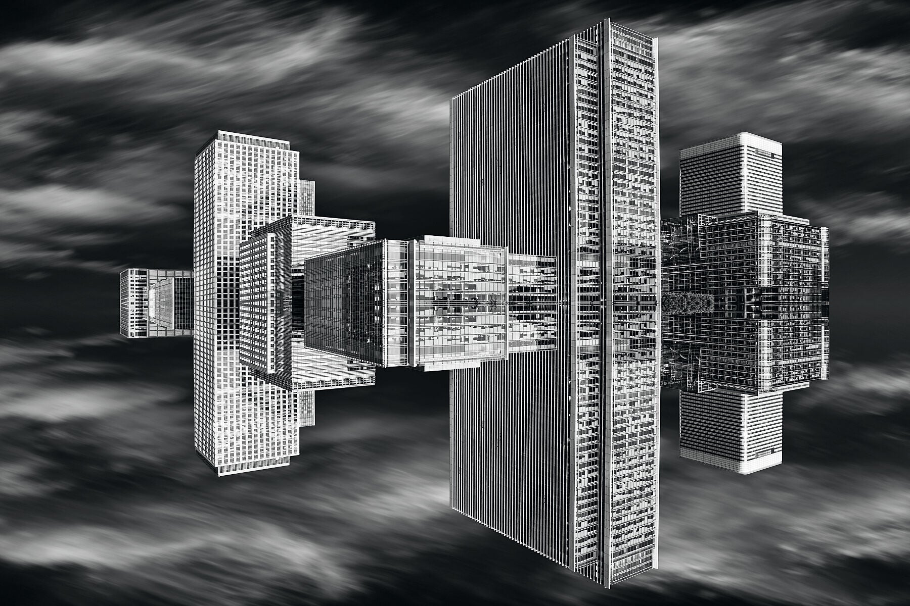 Surreal black and white, fine art image of the Upper Bank offices in Canary Wharf, London by the photographic artist, Anthony Weller