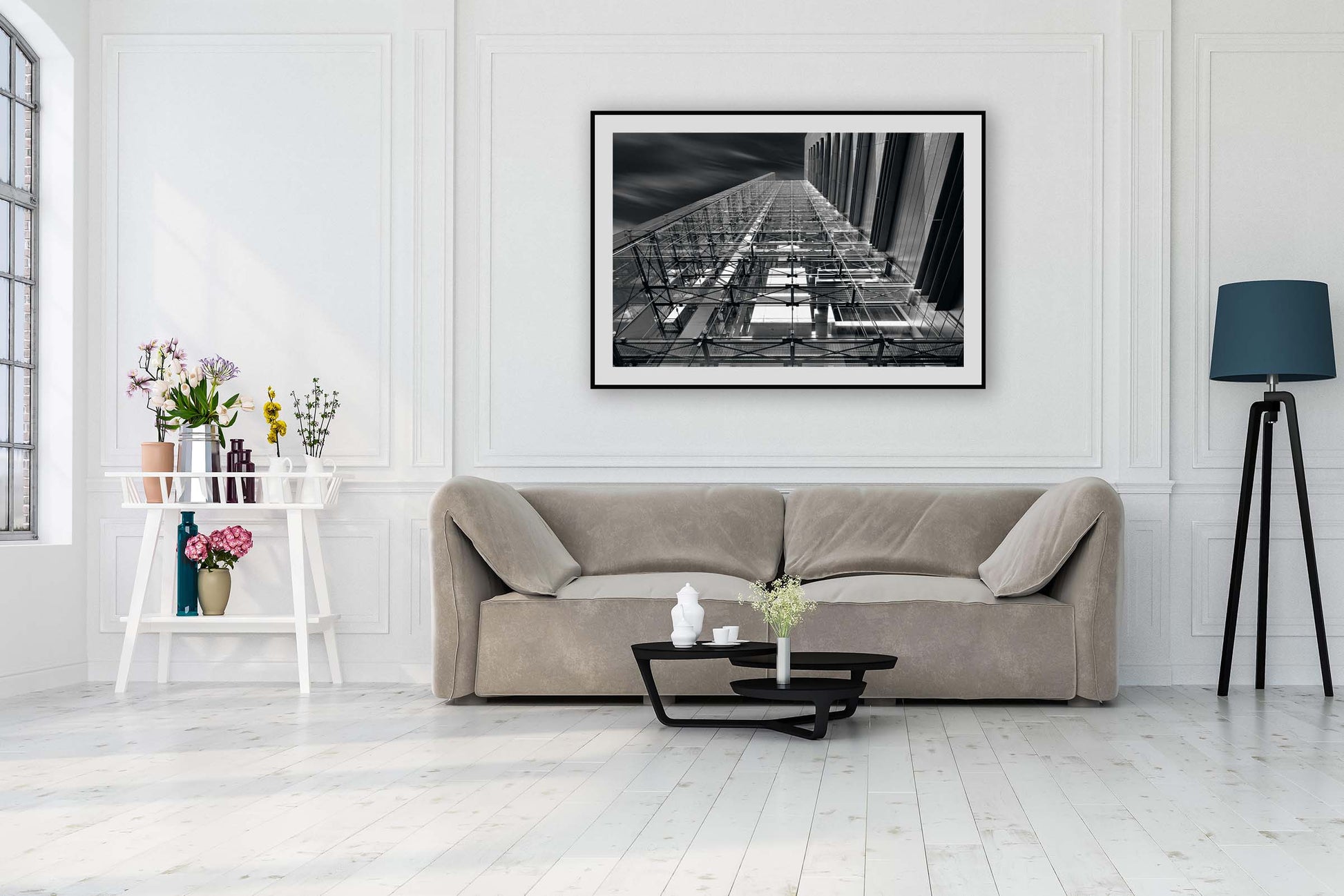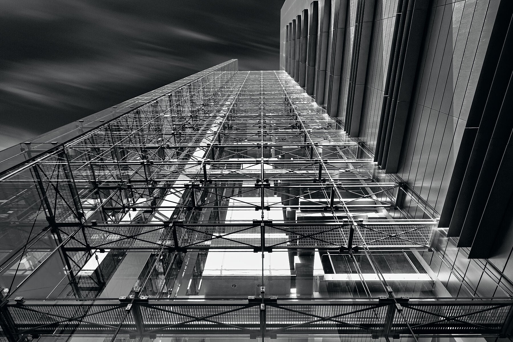 Stylish black and white, fine art image of the Manchester Civil Justice Centre by architects Denton Corker Marshall by the photographic artist, Anthony Weller