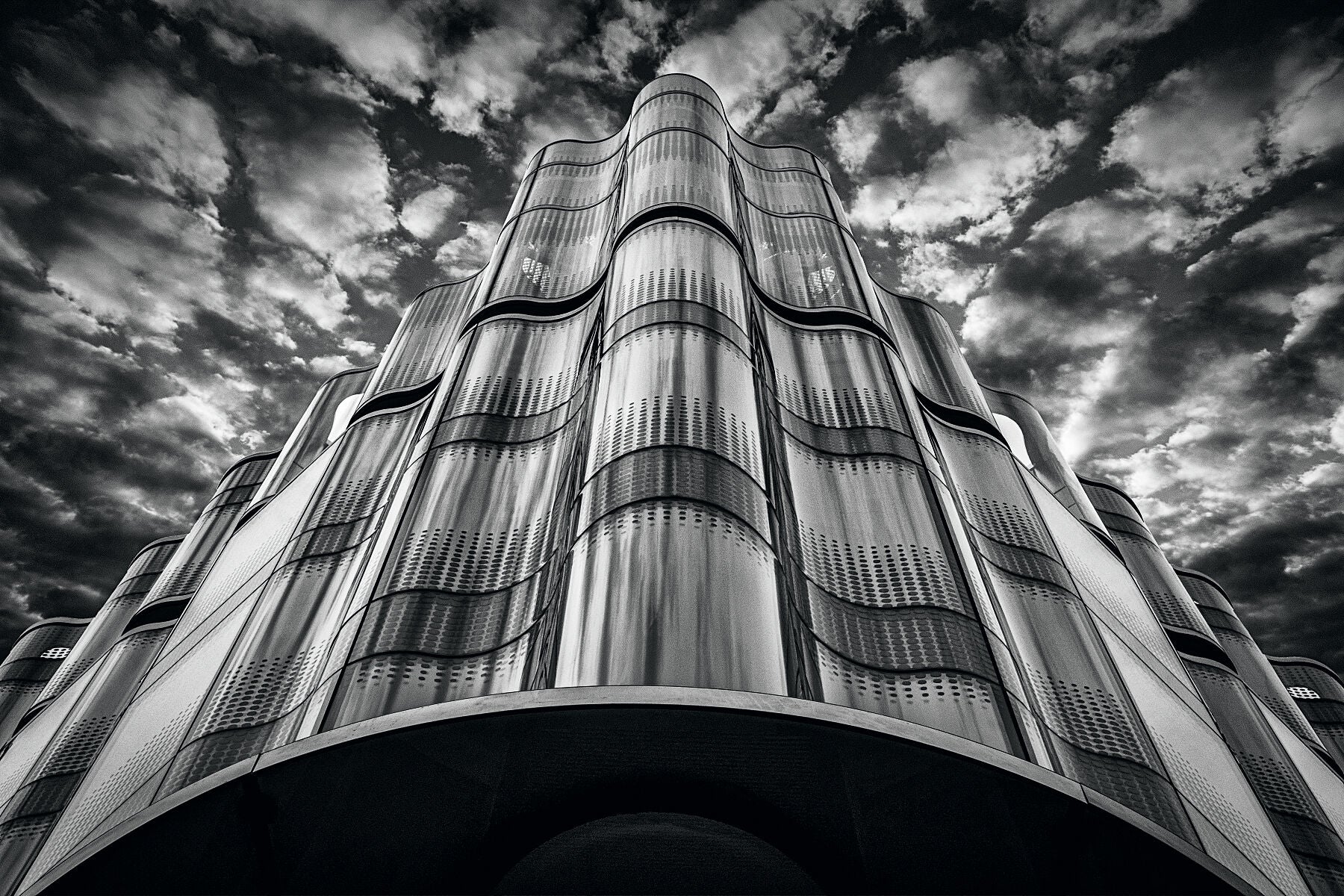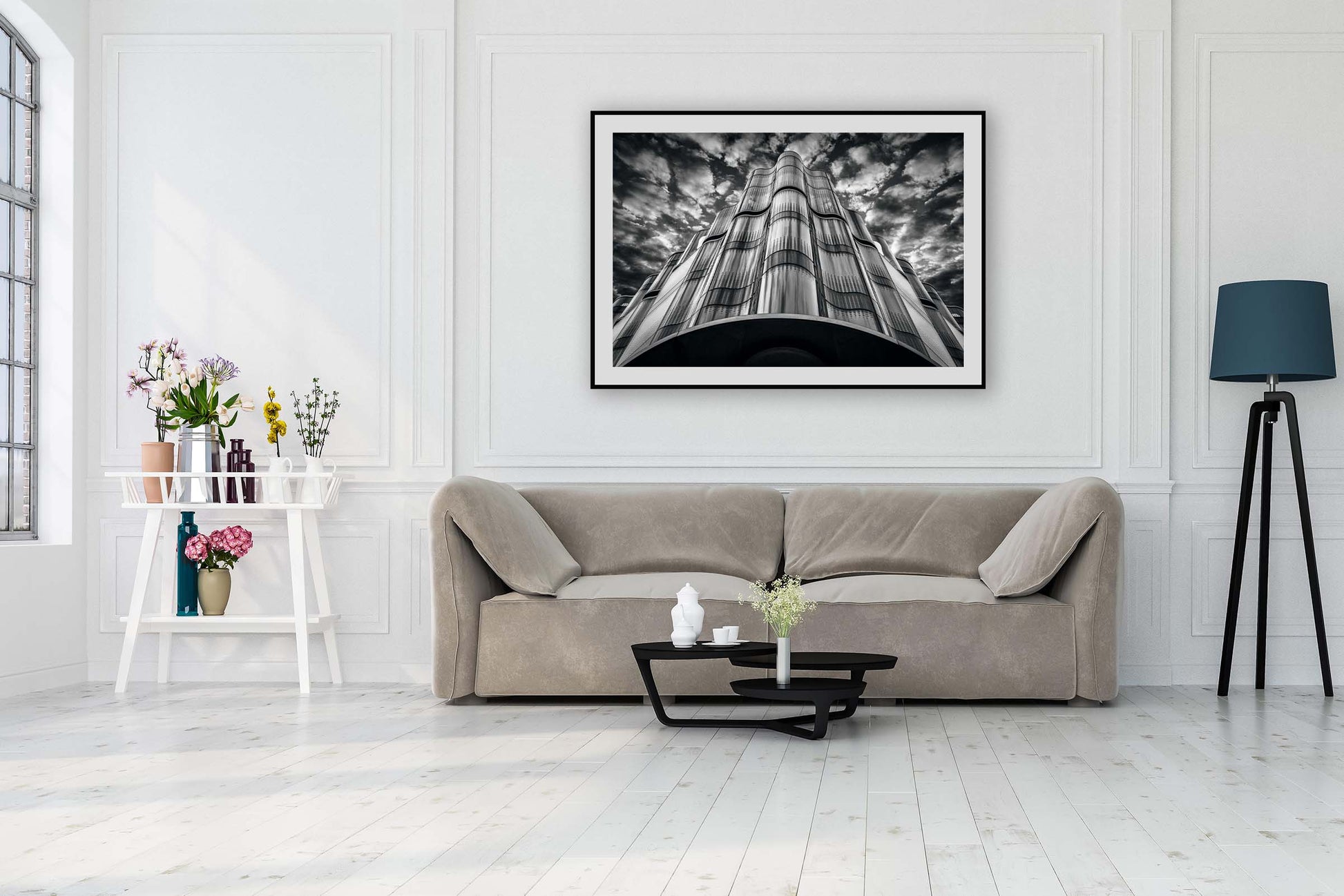 Eye-catching black and white, fine art image of a façade in Oxford Street, London by the photographic artist, Anthony Weller