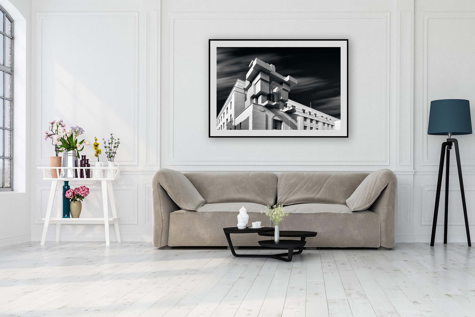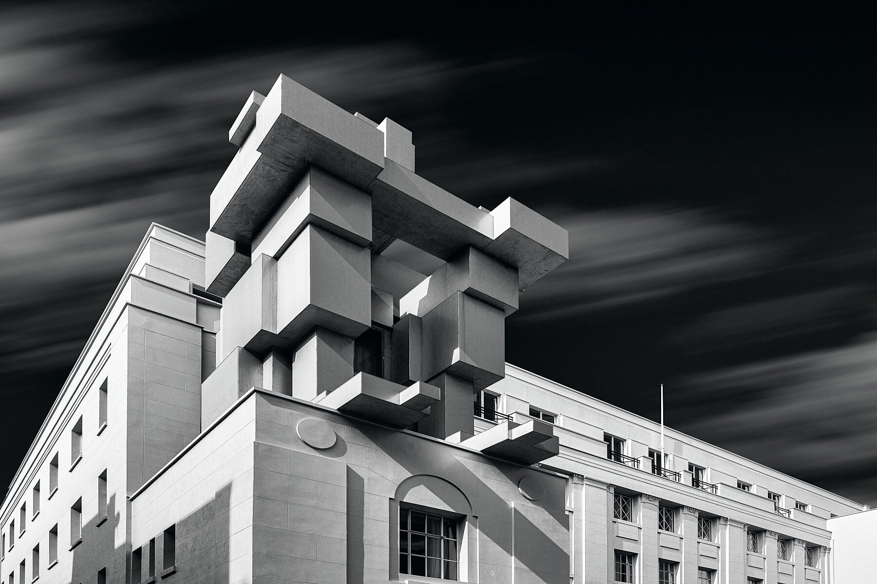 Stylish black and white, fine art image of the Beaumont Hotel with sculpture by Antony Gormley by the photographic artist, Anthony Weller
