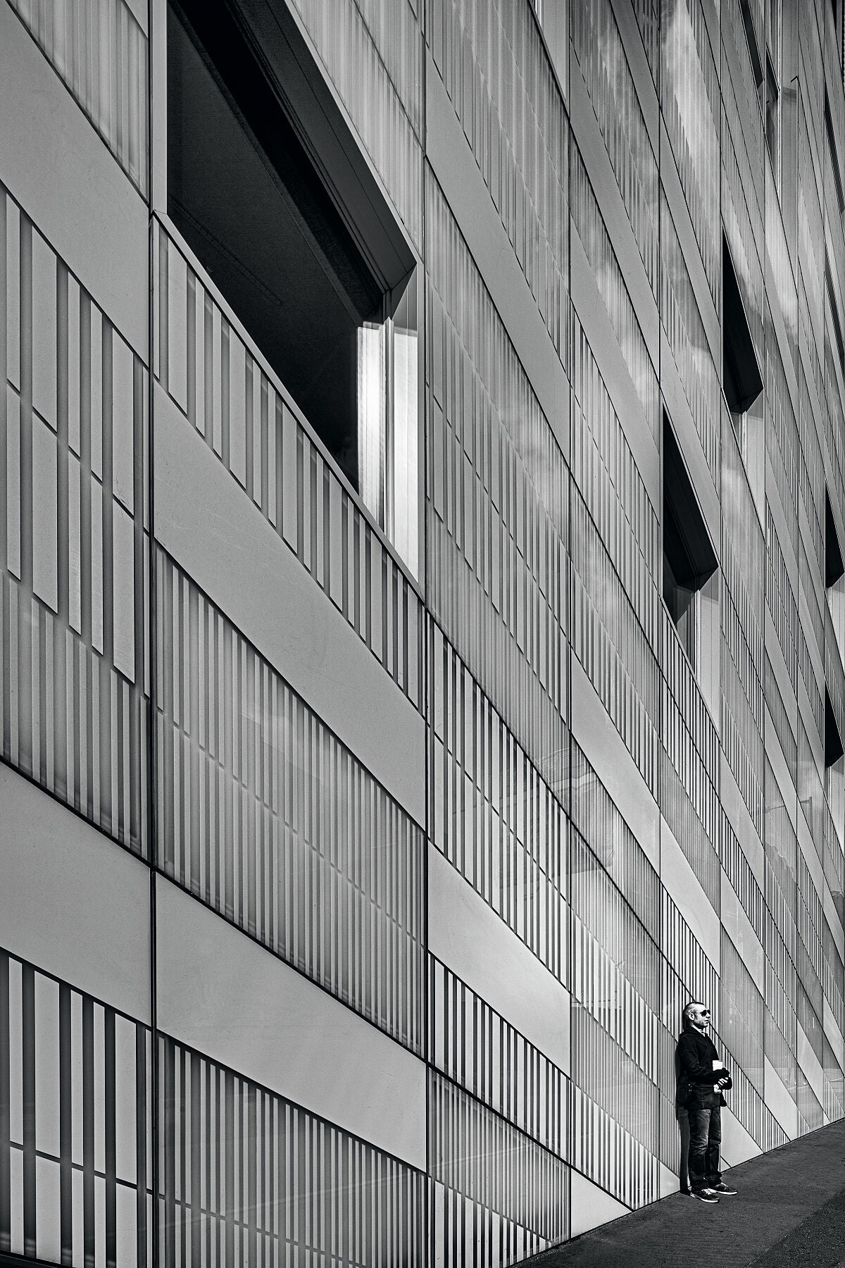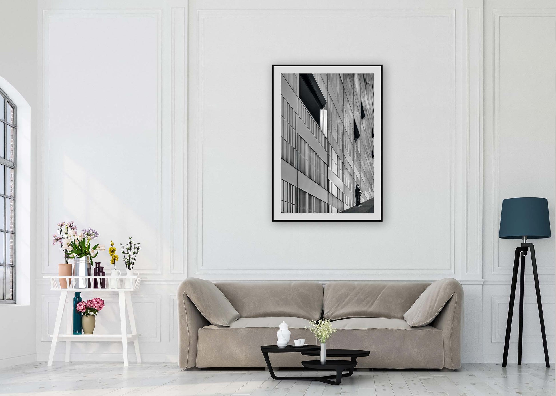 Eye-catching black and white, fine art image of perspective cladding on a building in City Road, London by the photographic artist, Anthony Weller