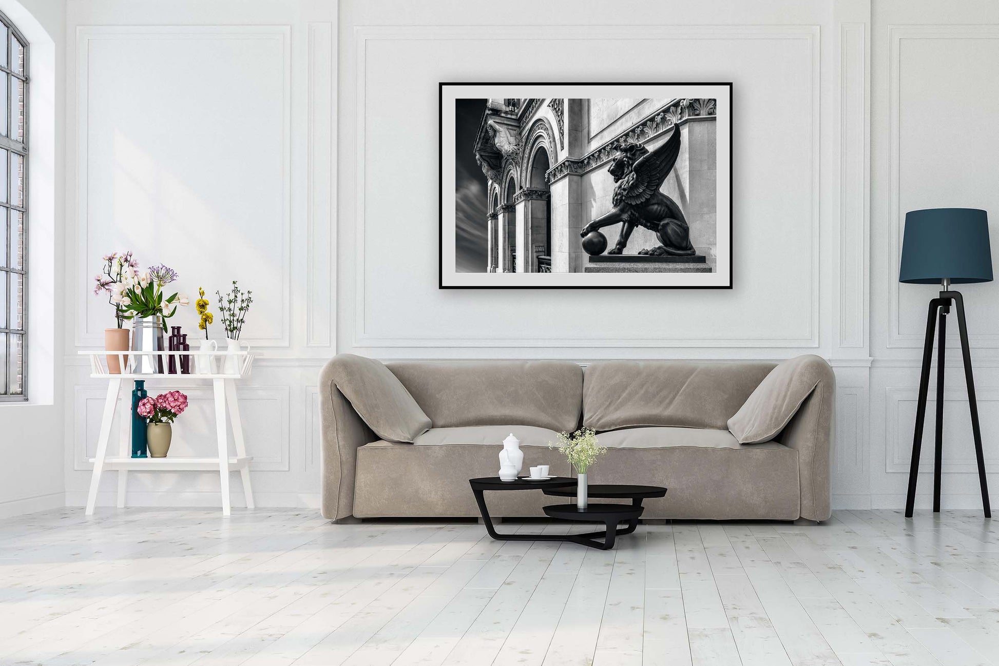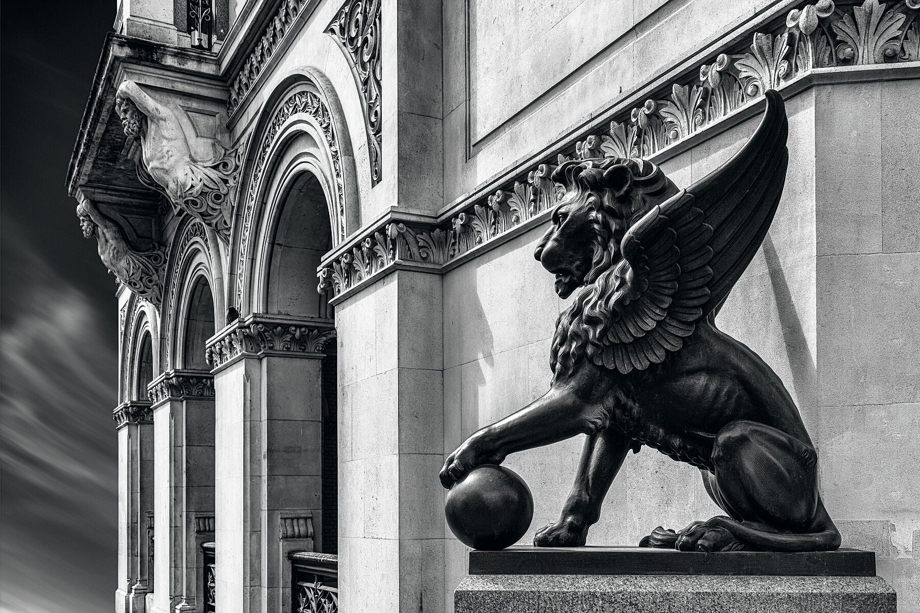 Beautiful black and white, fine art image of winged lion sculpted by Henry Bursill by the photographic artist, Anthony Weller