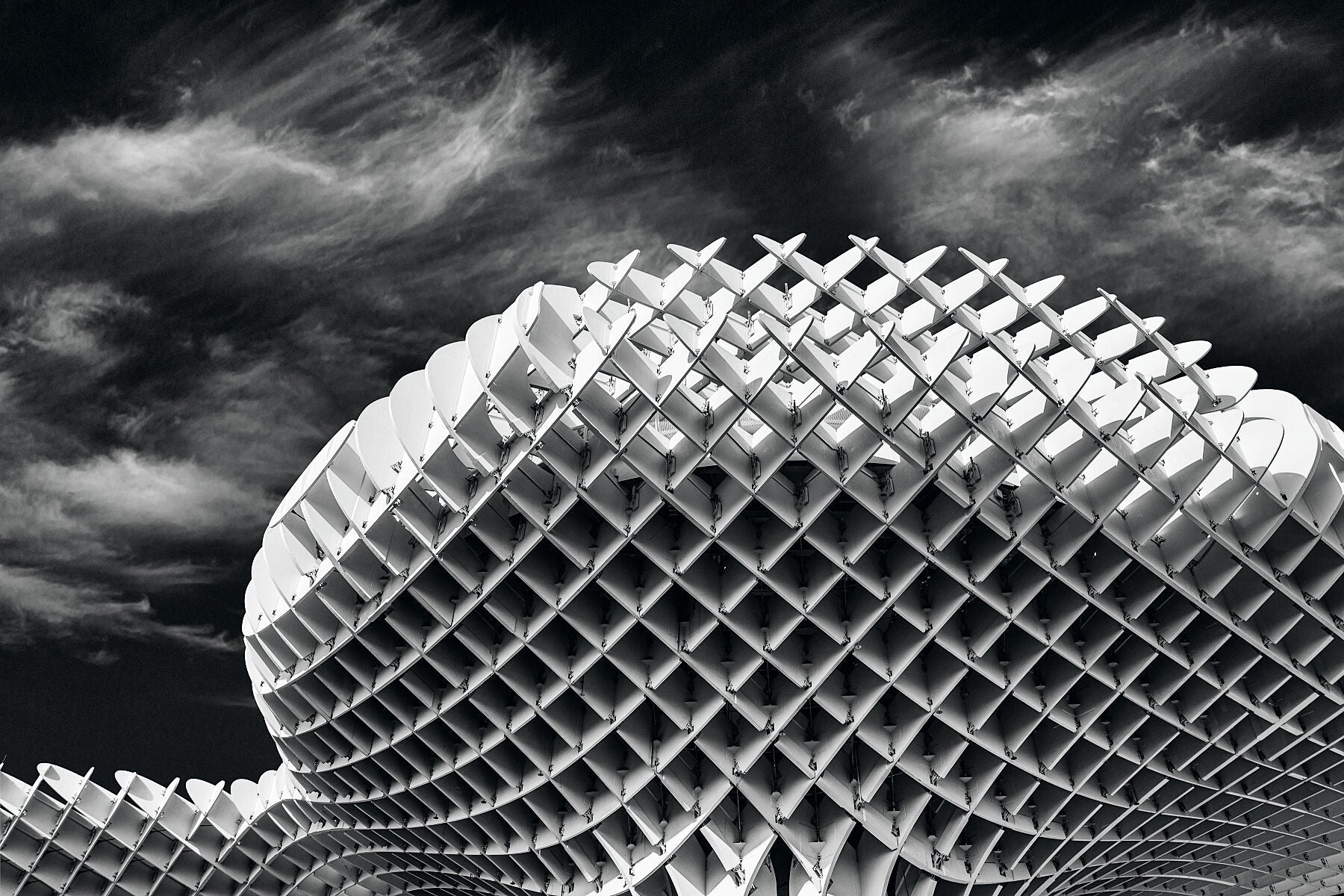 Elegant black and white, fine art image of the Metropol Parasol in Seville by architect Jürgen Mayer by the photographic artist, Anthony Weller