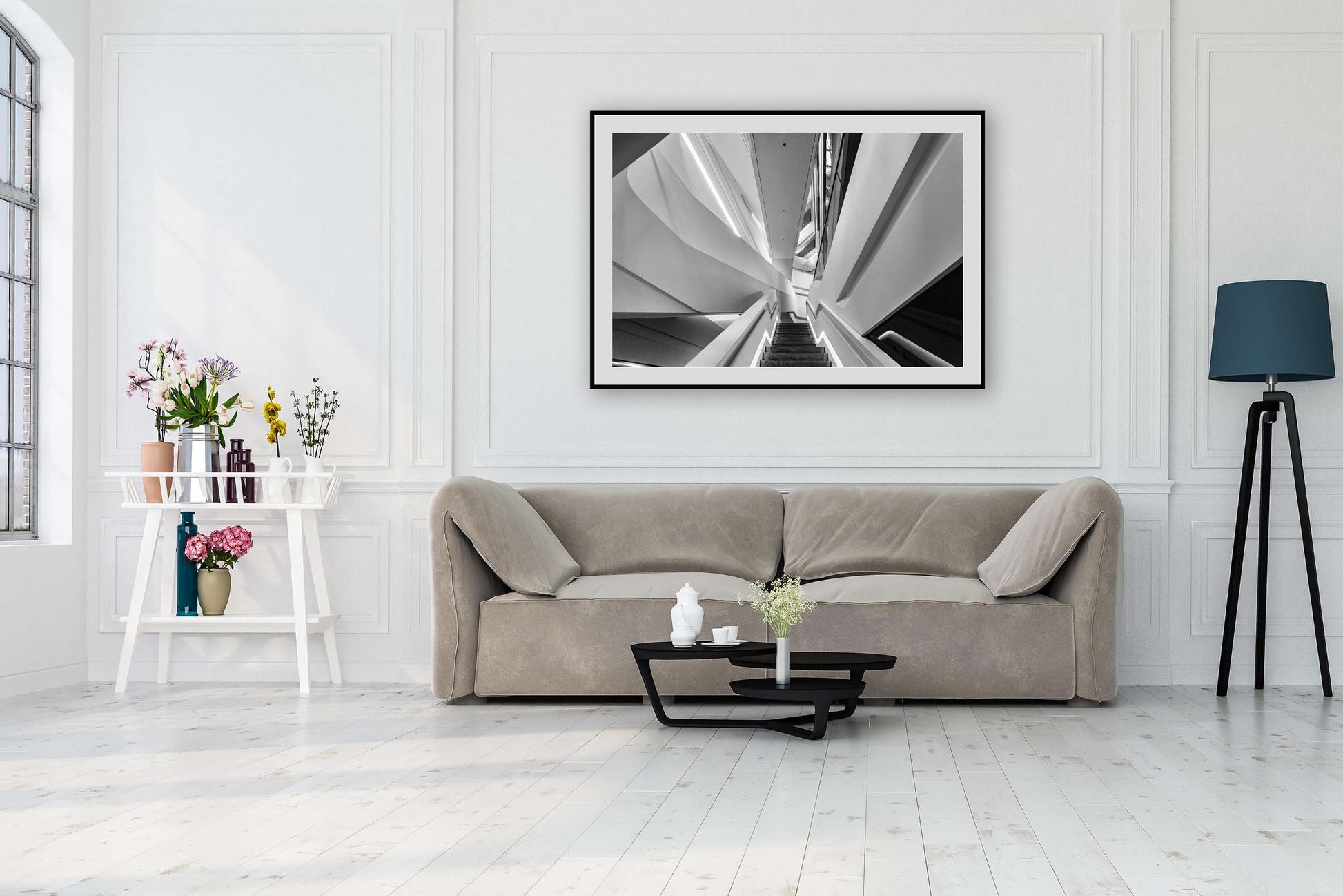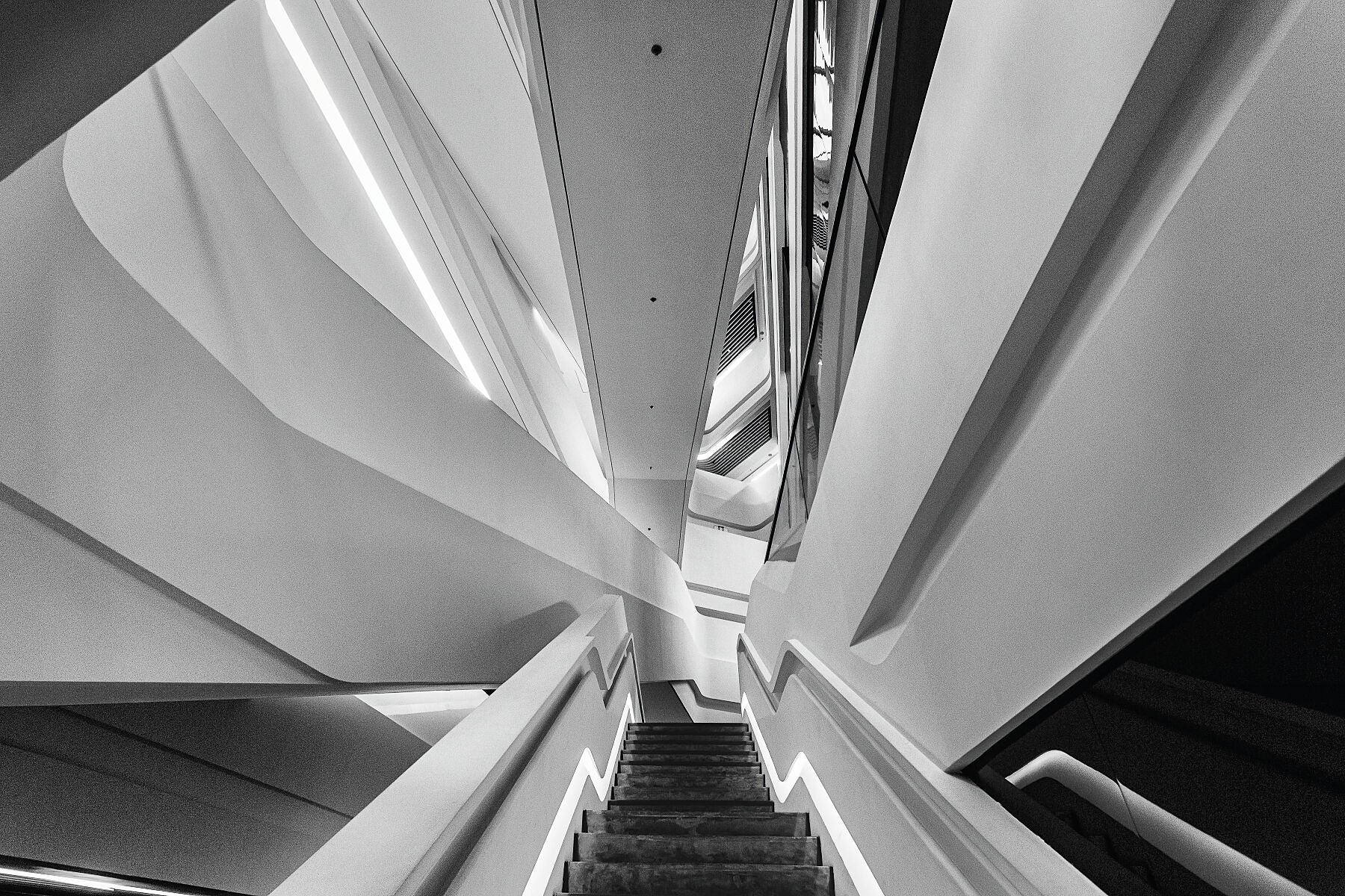 Stylish black and white, fine art image of the Jockey Club Innovation Tower by architect Zaha Hadid by the photographic artist, Anthony Weller