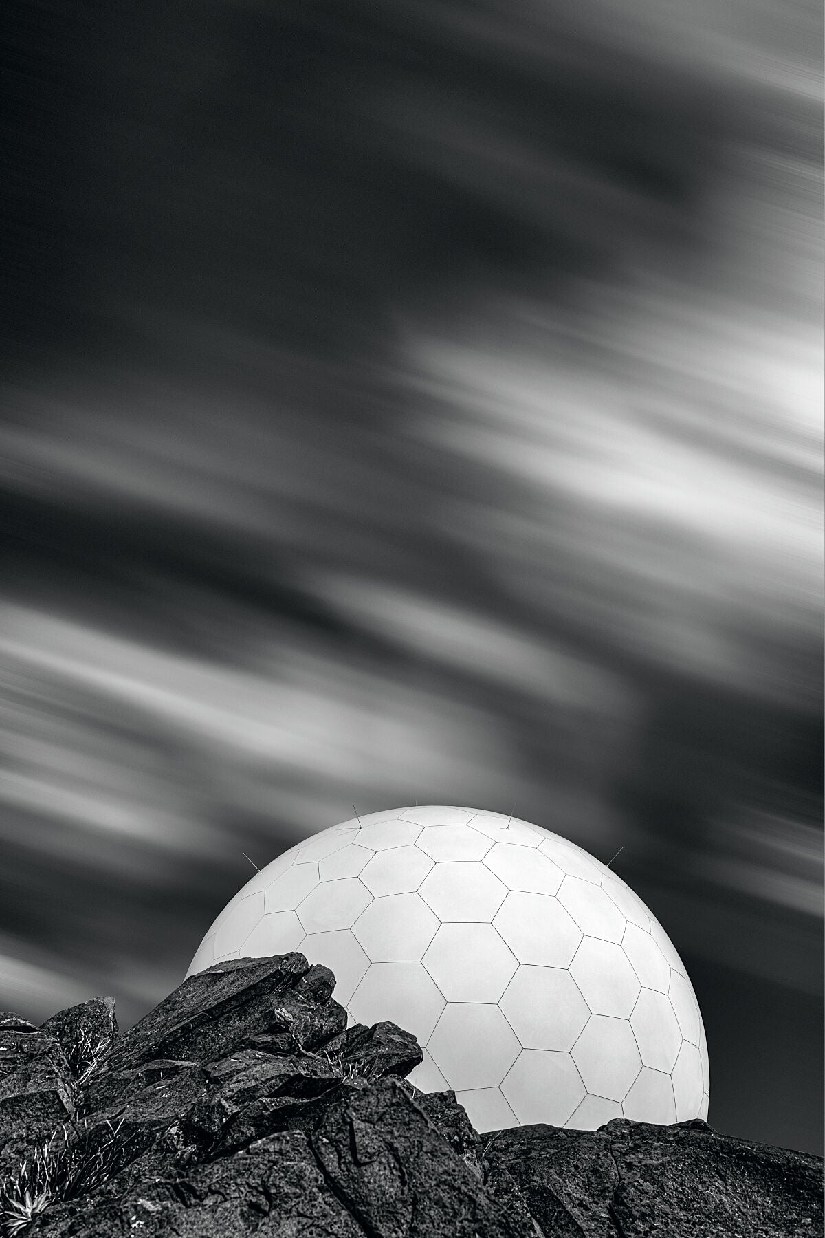 Striking black and white, fine art image of the Optical Observatory in Pico do Areeiro in Madeira by the photographic artist, Anthony Weller