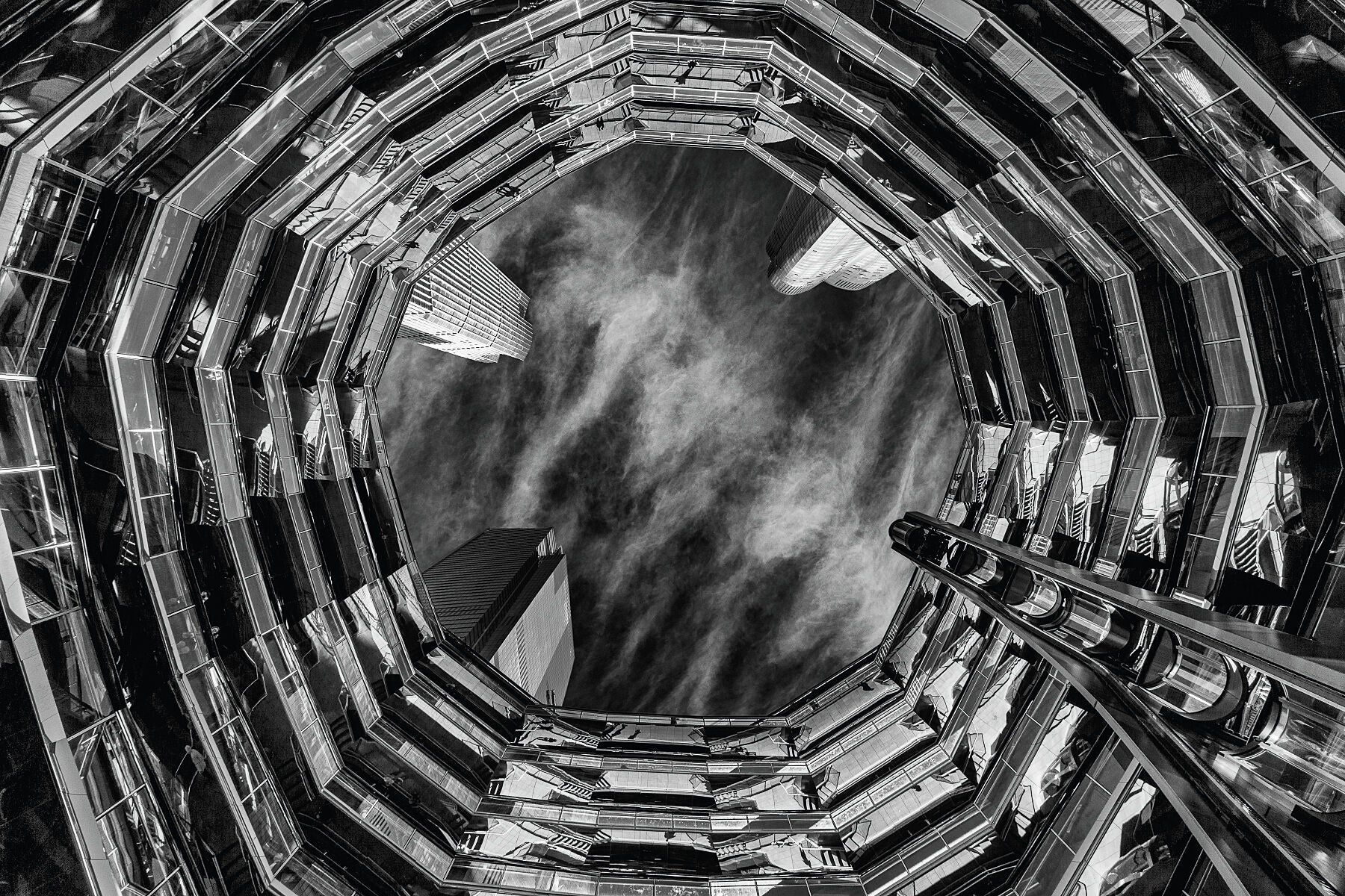 Stunning black and white, fine art image of the Vessel in New York by architect Thomas Heatherwick by the photographic artist, Anthony Weller.